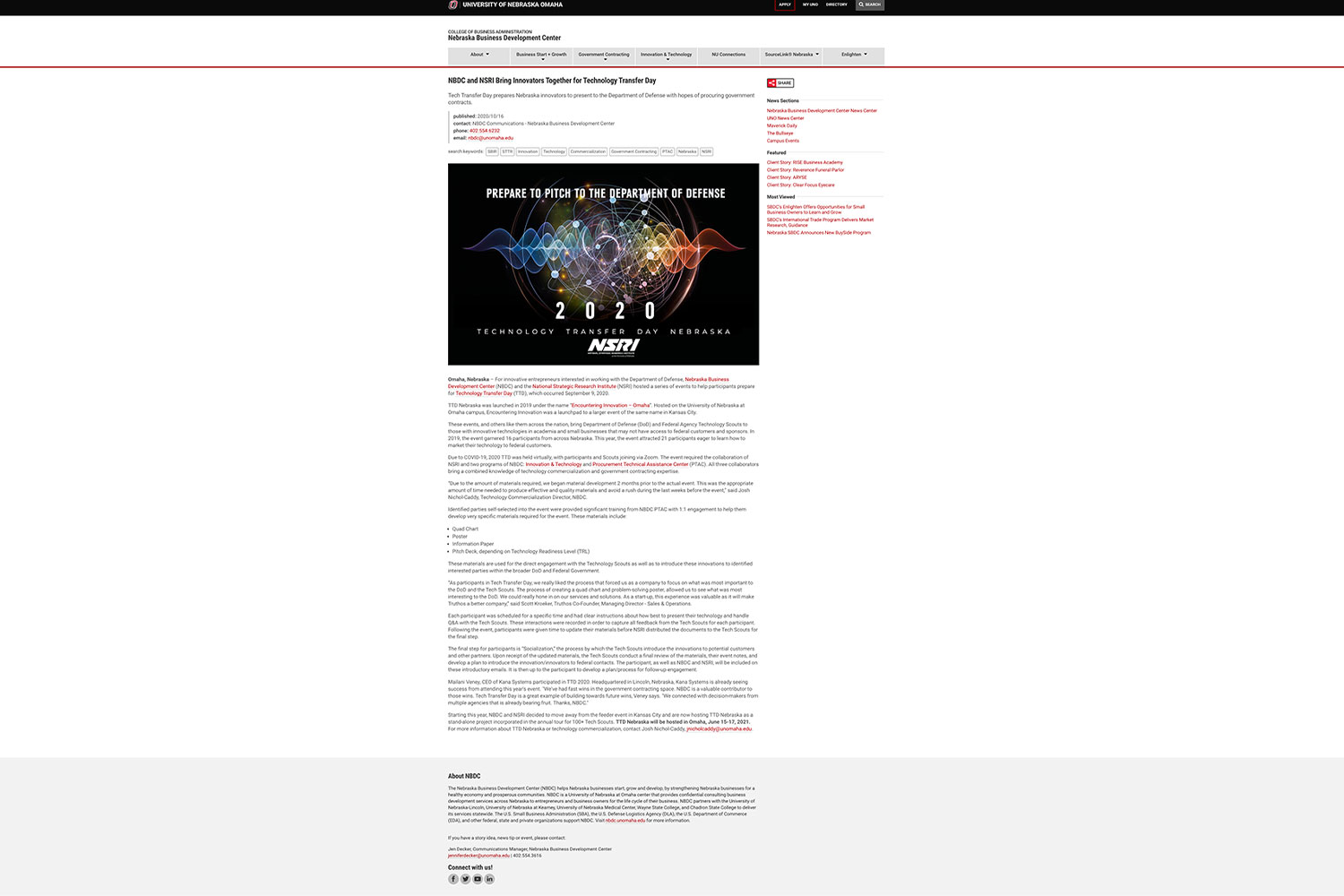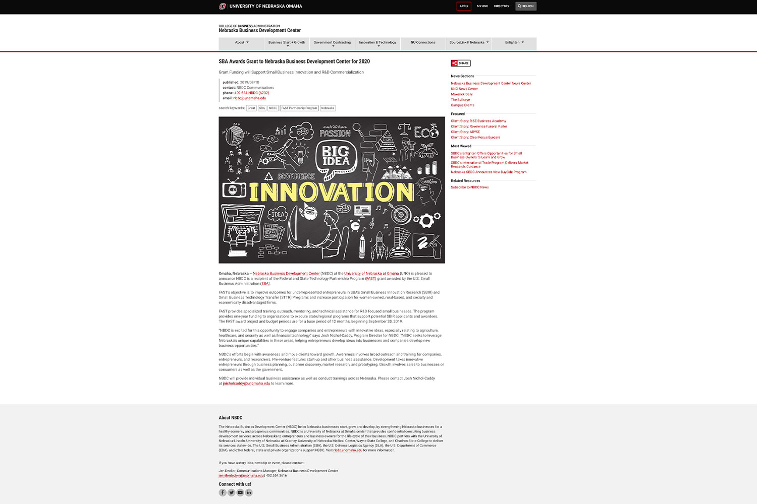 SBA Awards Grant to Nebraska Business Development Center for 2020